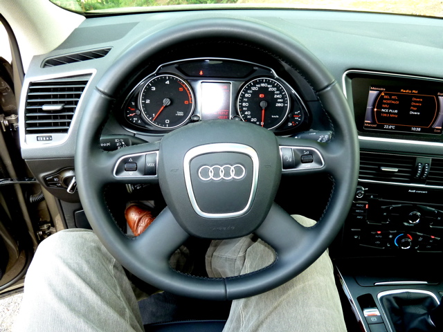Le Q5 est lourd mais tient le pavé comme une berline. Il faut dire que les concurrent Mercedes GLK et le BMW X3 ont réalisé un sans faute de ce côté. Audi se devait de faire aussi bien. Tout juste ressent-on une légère prise de roulis à vive allure mais l’amortissement de notre voiture d’essai est réglable in-board en trois positions: Confort – Normal – Dynamique. Aussi en fonction de la route, on passe du dandinement des SUV américains à la rigidité la plus complète. Même l’assistance de la direction varie. Mais au volant du Q5, on a tendance à adopter une conduite cool et le mode « Normal » est alors le meilleur compromis.
